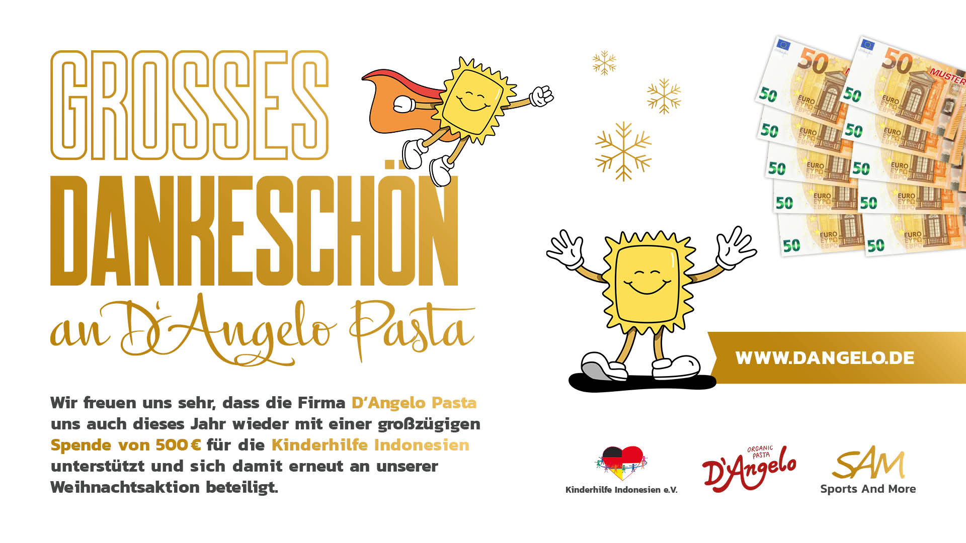 Wir freuen uns sehr, dass die Firma D’Angelo Pasta uns auch dieses Jahr wieder mit einer großzügigen Spende von 500 € für die Kinderhilfe Indonesien unterstützt und sich damit erneut an unserer Weihnachtsaktion beteiligt.